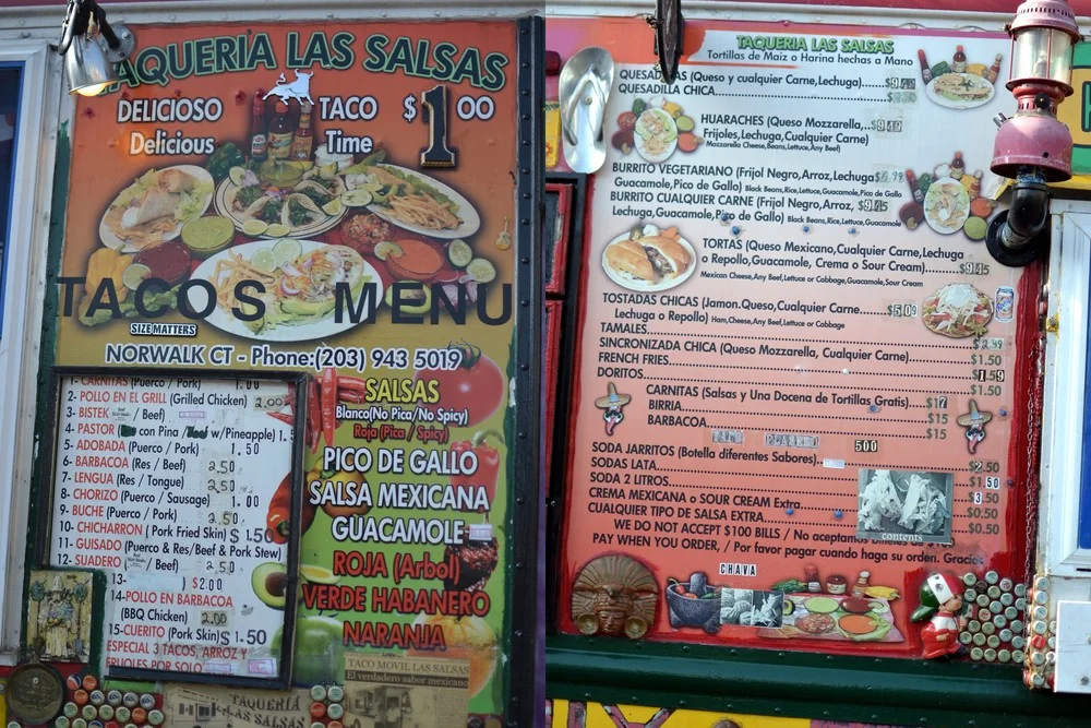 Restaurant Norwalk Tacos Mexican Lunch Taqueria Las Salsa Truck: Simple Tacos in Norwalk Jeff "jfood" Schlesinger August 03, 2014 What’s that brightly colored truck parked at the Auto-Zone in Norwalk serving?As you drive west/south on Route 1 in Norwalk and approach the Avalon apartments on the corner of Belden Ave, take a look to the right into the parking lot of the Auto-Zone. Several days a week, the site will include a colorfully decorated food truck with “Taqueria” emblazoned over the front windshield and a collage of articles, food photos and menus…all to tempt hungry customers into ordering one of numerous tacos, burritos and plates of Mexican inspired cuisine. That truck is Taqueria Las Salsa. I approached the side window and a head appeared from the passenger window to the right. All of the activity from ordering to delivery occurs near the front of the truck. My embarrassingly saying hello into the side window immediately marked me as a “newbie.” That was the owner Gil Hurtado, who has operated Taqueria Las Salsas for the last five years.On my two visits I tasted a variety of tacos, from pork to tongue. On my first visit I ordered the Carnitas (pork) and the Lengua (tongue). Hurtado asked if I wanted “everything,” and since I was looking for his best I quickly agreed. The size of each taco is typical taco truck 4” diameter, and Hurtado tops with a scant amount of filling plus a sprinkling of toppings, significantly less toppings than I have received at other trucks. The pork was very good, full of flavor and served with cilantro, tomato and pickled onions. The addition of the pickled onions versus raw onions was a good modification. The tongue was almost as good, and again the addition of the pickled onion was a great touch. A pleasant surprise was the order included tortillas, rice, black beans and cheese. These three simple ingredients were a great addition to a quick meal that cost a mere $3.50. On my second visit, I again ordered the Carnitas, and this time added the Bistek (beef), Chorizo (sausage), and Suadero (skirt steak). Again the pork was very good; easily the best of the four on this visit and again the pickled onions were the highlight. The chorizo taco was not as good. Served with cucumbers, pickled onions and cilantro, the chorizo did not deliver the zip I was hoping for. The two beef tacos were also in this category. Each was served with raw red onion, tomato and cilantro. The beef was overcooked, very dry and lacked any flavor. It was difficult to differentiate one from the other.My overall impression was that some of the tacos were good, but not great, tacos. Unlike Tacos El Azteca up the street, the addition of rice and beans was a nice and tasty touch, but if I had my choice, I would opt for Azteca.