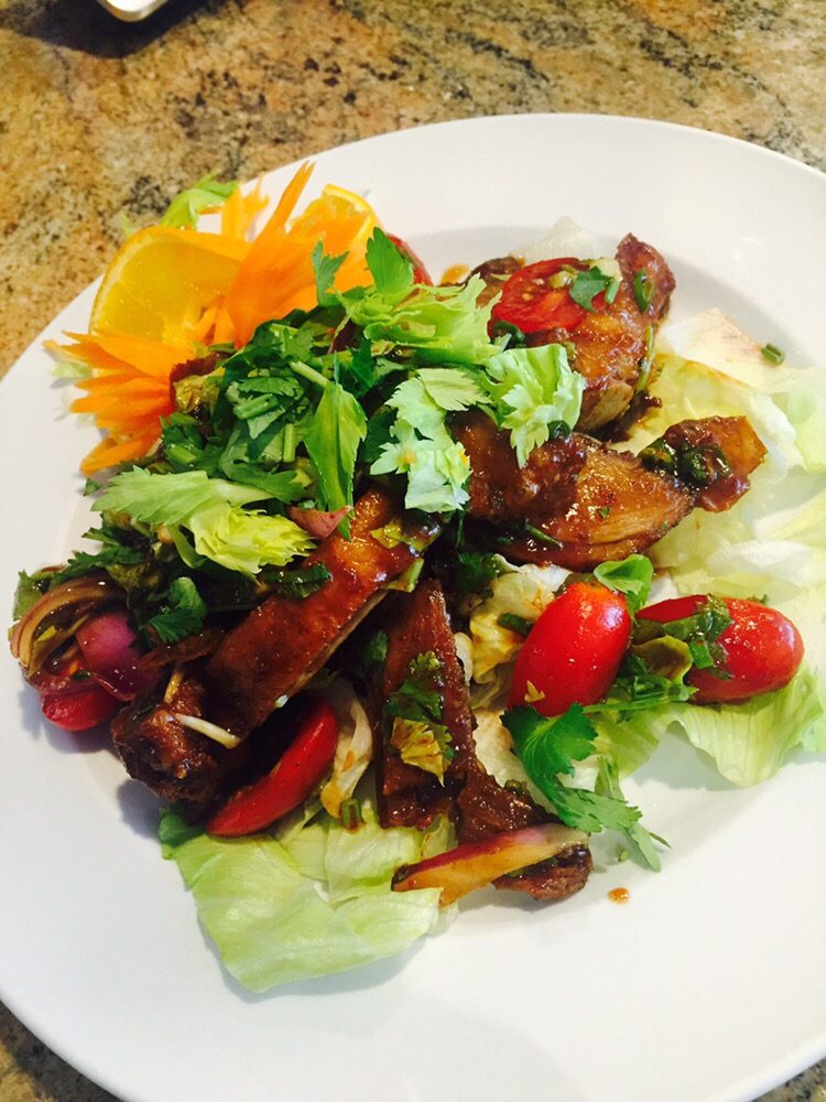 Restaurant Thai Fairfield Lunch Home Delivery Take Out Asian Homepage Thai Kit: Top Notch Thai Cuisine Found in Fairfield RealGuy March 26, 2017 The following article is the work of a new CTbites contributor, "Realguy." While this is his first review, Realguy is not new to the site. You may recognize his name as one of the most active commenters since CTbites' inception.The passage of time is strange. The distant past and the very recent can bend back on each other and almost touch, and what was once long ago can feel as real now as the blossoming of first love, as the comforting aroma of mom’s home cooking… Lately when I’m in the mood to go back up the river of time to that place in Southeast Asia that destiny would see us go just once, I visit Thai Kit on the Post Road in Fairfield. It's a brand new Thai restaurant with a couple of advantages over some other places I have tried. If you find yourself in the neighborhood, or if you live in the neighborhood, just past the McDonalds at the circle in Fairfield heading toward Black Rock on the left-hand side, Thai Kit is a delicious destination well worth exploring. Summer Shrimp Roll Her name is Nattima and she’s the lady of the house, and she’s also your hostess for your guided tour of Thai cuisine. In America for only three years, her short tenure here belies her already formidable success, earning already an MBA in finance and of course having just opened this quickly-growing restaurant. And she’s nice, radiating both beauty and sense of integrity. Her dedication to freshness is stated right on the menu andmy experiences at Thai Kit confirm her credo…freshness is key to the success of these (and really any) dishes.Green curry chicken (seen above) is my favorite. The one at Thai Kit is outstanding. The sauce is richer than some I’ve tasted, hot but not too hot. There are five other curries as well, and I also had another favorite, the massaman curry with beef. Really nice sauce, really fresh beef. Thai Kit Signature The Pla Rad Prik is a work in progress. It's a crispy fish filet in a chili sauce, and it's good, but getting better fast. The fish in question the night I ordered it was that denizen of bathtubs and fish farms across southeast Asia, the dreaded Tilapia. I won’t pull any punches. Because Tilapia, has no inherent flavor, it generally makes for a darned uninteresting fish. While talking with Nattima, I discovered that they are in the process of switching the fish filets from Tilapia to Red Snapper. That is a really good idea. Presently the whole fried fish is a sea bass, which is a good thing.Nattima was kind enough to sit down with me and tell me a little about her life back in Bangkok and growing up there and about coming to America and some of her experiences here. I ordered a plate of panfried sweet and sour shrimp while I contemplated her success. Nice and sweet, not too hot but a little bit spicy. Pad See Ew w/ Tofu Fried pork dumplings. Mmm good. Really nice pork, really delicious dumplings. Crab Rangoon. Actually I don't eat crab, since watching a documentary about what happened to Amelia Earhardt and her first mate Noonan on that tiny pacific island they crashed onto. What did happen? Well, let's put it this way…On Gilligans Island they slept on hammocks for a reason. Duck Salad Pad Thai, Pineapple fried rice, are all “on point”, as a certain spiky-haired friend would say. I also devoured beef with garlic sauce. Kind of reminiscent of Chinese. Lemongrass shrimp and Mango chicken are both excellent options. Beyond tasty, there’s a quality here across the entire menu that is worthy of attention. But who knew that the best, and for me most adventurous dish was yet to come? When I was a kid we had a family of ducks that would season on our property. One year a male died (shot dead by a crazy chef with a hankering for duck fried rice, no doubt) leaving a female without a mate. My mom used to sit outside with her and they would talk and spend all afternoon together one summer. Anyway, she never made her best dish, duck a l’orange, ever again. Now I myself have few such qualms and preconceptions. I used to work in an office with an unbelievable view of Times Square and my buddies and I would often lunch splendidly on the glorious, glistening ducks dangling in the front windows of the one great Chinese place left on 39th street; a man would stand in front chopping them up on round wooden butcher’s blocks. Fun times. But the most fun time was the time my drunk friend Paul, an excellent salesman but a bit of a rapscallion, went in alone and ran up an enormous bill with no intention of paying, and the Chinese guys were hunting for him all around Midtown for months, looking even in the offices above when they would make deliveries. But I do digress.Duck is ubiquitous in southeast Asia, but here in America it can be absent, or hit-or-miss when it is on a menu. Thai Kit makes three duck dishes, one of which was ONE OF THE BEST THINGS I'VE EATEN ALL YEAR and it's been a very good year of eating (thank you Brian, I’m going to the tailors’ to have the pants adjusted). The basic one is called Home Style Duck, which is half a duck, roasted and then deep fried, in a sauce of tamarind and orange with some veg like broccoli and snow peas. This dish blew me away; it is as interesting a meal as anything in Fairfield county now. Kind of reminds me of my mom's duck from long ago. The orange one, not the one from the yard. The two other duck dishes are spicier, the first one is basil duck, and the second one is duck in a red curry and coconut milk sauce. Tom Kar Chicken via May K. I will leave it to you intrepid reviewers to report back to me what delights you may discover in the far corners of Thai Kit’s menu. In the meantime, I will be out and about dining anonymously, tasting here and nibbling there until the top destinations have been discovered and reported on by me, your trusted tastemaker and general tre