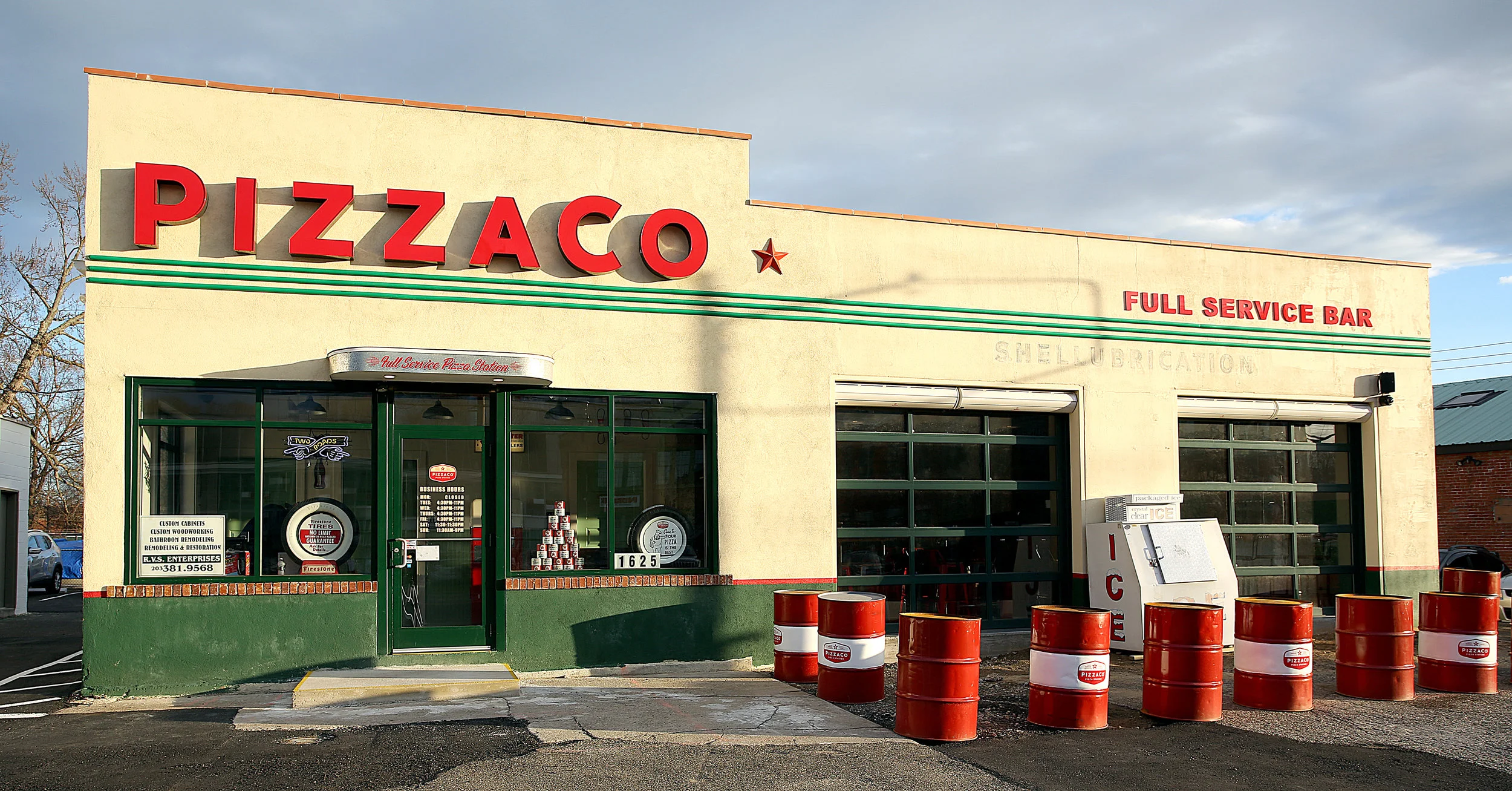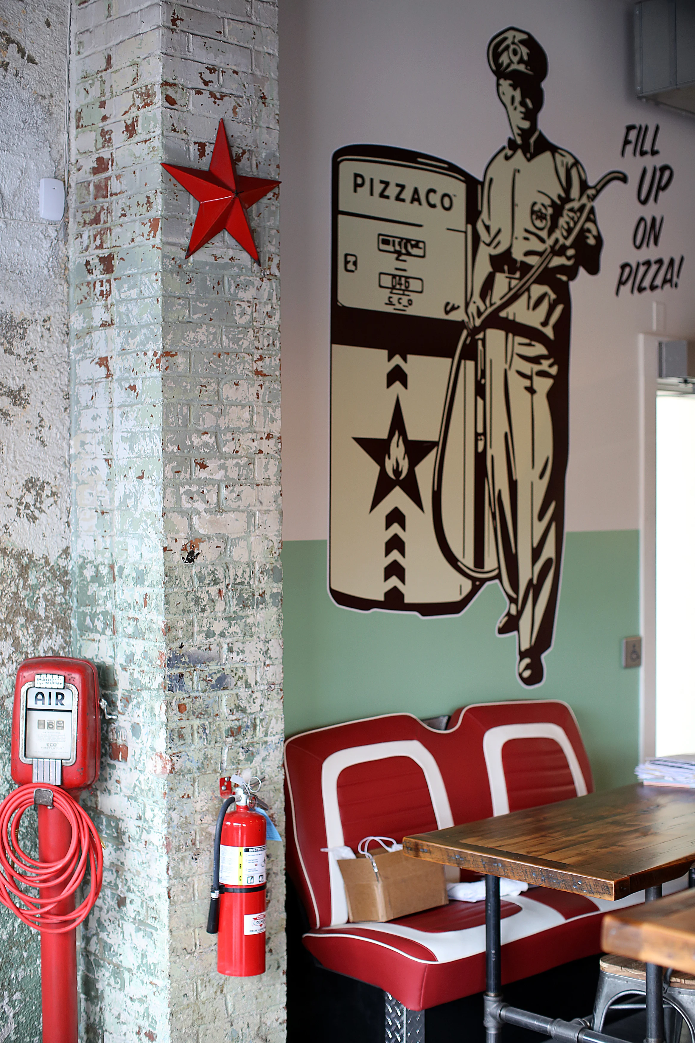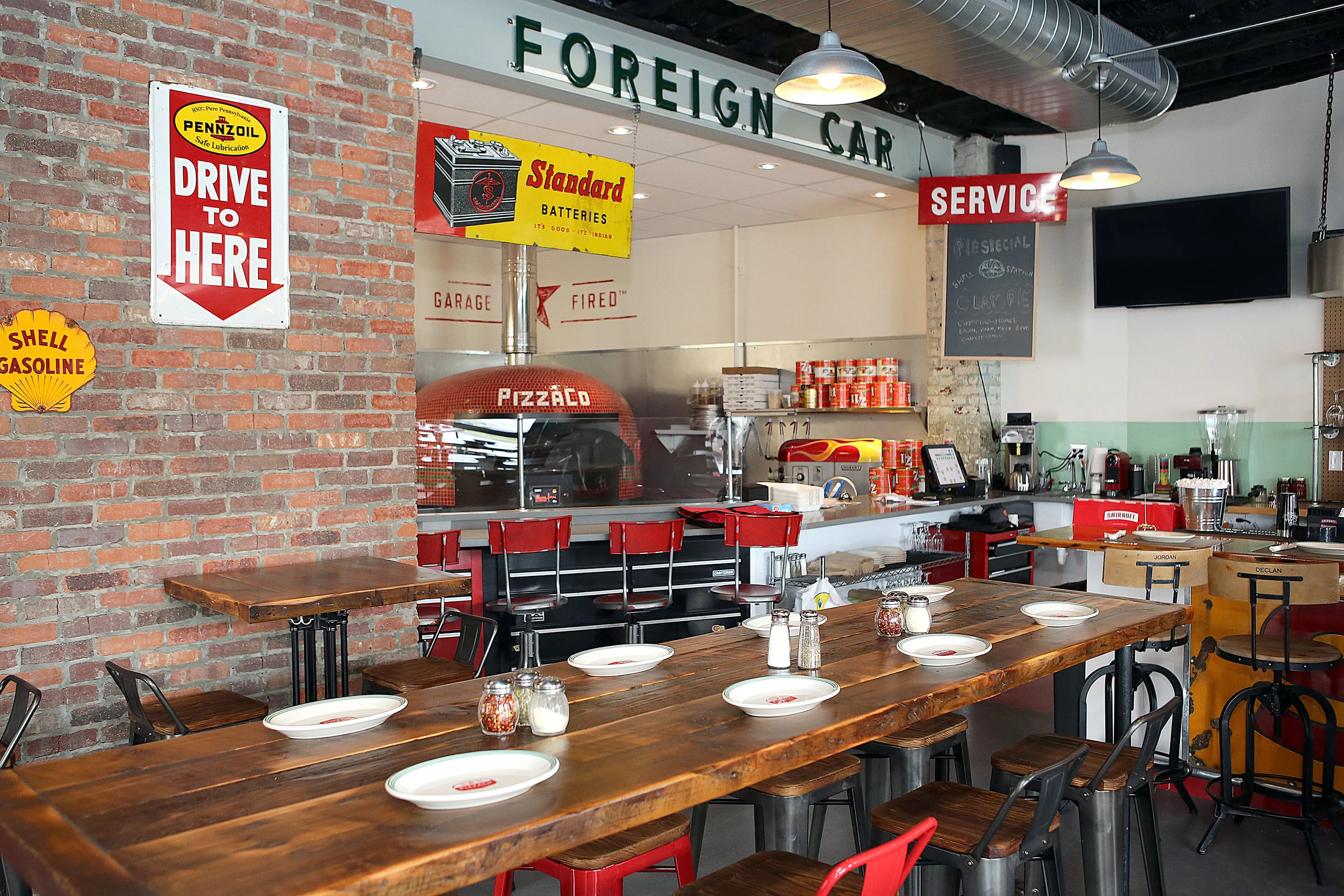 Restaurant Stratford Pizza Lunch CT Beer Kid Friendly Celebrity Chef Homepage PizzaCo Opens in Stratford: Bruno DiFabio Creates Garage-Fired Pizza James Gribbon April 02, 2017 The first hot rod movement was sparked by people who realized cast off objects still had plenty of potential. Kids walking to school in post WWII America passed junkyards where derelict Model T Fords, relics even then, baked in the sun. An after school job's income could net you one of those heaps, and with it came your first taste of independence. Dropping in a salvaged flathead V-8 could make that old bucket loud, fast, and dangerous. The sexy combination was like flypaper to teenagers and young veterans, and their creativity launched an American culture.Newly opened PizzaCo, just across the street from Two Roads Brewing Company, is one such hot rod. Once the site of several thoroughly defunct gas stations, the old place has been cleaned up, given a new paint job, and had its own motor swap. The driving engine is now a Marra Forni oven. They call their pizza "Garage Fired," and PizzaCo's edge was hiring world champion Bruno DiFabio to create it. If the name sounds familiar, it's because you've seen Bruno on the Food Network, or had his pizza at Amore Cucina & Bar in Stamford's Springdale neighborhood. Bruno has won the world pizza championships six times, and owns The Academy of Pizza Science. PizzaCo co-owner Jordan Bochanis has worked extensively with Two Roads designing labels and merchandise, and drove past the location regularly before bringing it back to life. "We hired Bruno as a consultant, and he hung in there way above and beyond what we hired him to do," he told CTBites. "Bruno created the pizza, worked in our kitchen, and recommended the oven. All of our kitchen staff do residencies at Village Tavern and Amore before they work here." The dough he created for PizzaCo takes three days to make. On the first day the flour and water are mixed and left to leaven slightly into a "mother" dough. On the second, the fresh dough is mixed with a starter dough from a previously finished batch, and by the third, the dough is ready for the oven. Walk inside and PizzaCo's heritage is all around you. Vintage fuel pumps, signs advertising foreign and domestic car service, and other automobilia abound. The Hobart mixer has a flame job, and the beer tap has been pinstriped. TVs play old greaser flicks on either side of a bar labeled "LUBRICATION." Garage bay doors promise to let in warm breezes and the sound of revving engines on summer nights. Over a few trips I was able to sample several different pizzas and side plates. Appetizers are called Engine Starters on the menu, and the meatballs come three at a time, dressed with pomodoro sauce, and gathered around a scoop of herbed ricotta. The meatballs are loosely packed without a lot of bread or other adjuncts, and well spiced under the sweet, fresh tasting tomato sauce. The ricotta almost seems like icing in this context, and adds a smooth roundness to the herbs and meat. I chose to get the Oven-Fired Chicken Wings with the house made spicy rub - the other options being garlic herb wings - and they arrived with two creamy dips, one with added hot sauce. The rub was extremely tasty. With plenty of heat and smoke, it complimented the chicken greatly. The wings themselves were not as good. They were slightly small, and the meat had pulled away from the bone, possibly during the cooking process. I'll call it a hiccup in quality control during the restaurant's early running until I see it again. One of PizzaCo's must have pies is the Scamotz (pronounced "ska-moats"), a vintage Bridgeport pizza made with tomato sauce, oregano, garlic, and Scamorza cheese. It's about 12" across, like every pizza there, and the simplicity allows each of the ingredients to be appreciated. PizzaCo seems to have a heavy hand with garlic in all their creations, and I'm a fan, but it highlights rather than overpowers the sweet tomato sauce and pungent Scamorza in the Scamotz. The crust is arguably the best part about anything from PizzaCo. The rotating floor, gas oven (would you expect anything else in a garage?) is kept screaming hot, and the crust bubbles and caramelizes at its edges without being overdone. The outside of the crust retains a chewy, yeasty interior which makes tossing it aside borderline sinful. The Full Service Special - some may dare call it a Meat Lover's - with tomato sauce, pepperoni, ham, sausage, ground meatballs, mozzarella, ricotta and oregano was the only pie which had the fortitude to make the crust an afterthought. The Margarita, with just red sauce, basil, and bright circles of melted fresh mozzarella is your yardstick "plain cheese" pizza, and it's likewise excellent, largely due to the quality of the ingredients. Bochanis told us he felt free to use better ingredients in a $12, 12" pizza partially due to PizzaCo's close proximity to Two Roads. "The people who go there know better quality, and we thought we could establish a place doing craft pizza, and people who looked for craft beer would appreciate it and respond."The Green Light is a white pizza made with a smaller amount of ricotta and mozzarella, and topped with fresh spinach. The spinach wilts down fairly quickly on the hot pie, but isn't otherwise adversely affected, and the combination of the cheese and greens on a base of outstanding crust, plus plenty of garlic of course, keeps the slices light, yet very satisfying. The plan is to increase the use of seasonal ingredients as they become available, so the menu should change periodically. PizzaCo serves gelato made for them by Cafe Madeline of Fairfield which incorporates Two Roads Espressway coffee stout. The stout itself is effectively cold brewed with a mixture of Ethiopian and Sumatran beans, and the result is a dense, rich coffee gelato with the barest hint of alcohol detectable right on the roof of your mouth. A spring gelato made with Two Roads Road Jam