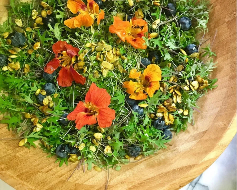 Features Recipe Recipe Farmers Market healthy Summer Microgreen, Kale and Blueberry Salad Recipe via Embody Stephanie Webster August 01, 2017 Embody believes in eating local, keeping things simply and honoring ourselves by eating real food! This summer salad with edible Nasturium flowers makes for a beautiful dish to bring to parties or just to enjoy on your own. Takes only 15 minutes to make! Also, the majority of the ingredients are LOCAL (from the Westport CT Farmers Market) and all are organic. This salad is packed with nutrients from the kale and microgreens. Protein, iron, omegas, magnesium and zinc from the pumpkin seeds. Anti-inflammatory goodness from the turmeric and antioxidant boosting from the blueberries. We paired the salad with an Apple Cider Vinegar detoxing dressing. It’s a staple dressing and marinade in our home. We just adore the combination of these real foods!Enjoy!Summer Microgreen, Kale and Blueberry Salad Recipe via EmbodyIngredients:*use organic and local4 handfuls of baby kale (pre-washed)2 handfuls of any microgreen of your choice1/2 cups of blueberries4-8 Nasturium flowers (optional)Roasted Turmeric Pumpkin Seeds1/2 cup of raw organic pumpkin seeds (we love “Go Raw” brand)2 tsp of TurmericSplash of Apple Cider Vinegar + EVOO + Himalayan Sea SaltApple Cider Vinaigrette Healthy Dressing (ACV):1 tbsp Dijon3 tbsp ACV1 tsp high quality maple syrup½ cup of extra virgin olive oilSea SaltPepperSquirt of Lemon (~1 tbsp)Directions:Pre-head oven to 350. On parchment paper add the pumpkin seeds, turmeric, Himalayan sea salt and a small drizzle of EVOO + ACV. Ensure the seeds are well coated. Bake for 10 minutes. For the salad, mix all ingredients together. Then top with pumpkin seeds and dressing. Toss it up.Dressing: Mix all ingredients by had and/or in a mini-blender.