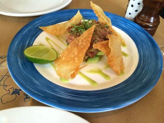 Restaurant Greenwich French Mediterranean Lunch Homepage Le Fat Poodle – Chic Dining in Old Greenwich … With a Wink Lou Gorfain August 13, 2017 Unlike its Franco-centric siblings – the Le Penguins in Greenwich and Westport-- Le Fat Poodle is a Parisian Bistro in name only. Indeed, its faux French appellation comes with a big wink, setting the mood for the whimsy inside what was once a stately U.S. Post Office. The soaring ceilings, whirling fans, and leafy palms suggest sexy Saigon rather than teeming Paris. That’s Pink Martini on the playlist, not Piaf. And the menu? Global far more than Gallic. No arrondissements here. Just crossroads….East meets West via seductive Vietnamese egg rolls. Or there’s Swiss fondue to spark a party without borders. Sample Spanish Ceviche or blistered Japanese Shushito Peppers. Bite into creamy Tuscan Ravioli, plump with wild mushrooms. Dip into a fluffy Hummus Kawarma, inspired by Ottolenghi’s Jerusalem. Savor tender rubbed pork belly, by way of the American South. Or grin at the “Pu-Pu Platter” that’s mischievously placed at the top of the menu, and then rave at its mouthwatering reinvention.“This is a Global Bistro, not a French Bistro,” insists veteran restaurateur Anshu Vidyarthi. Their style might be light-hearted, but he and co-owner Antoine Blech brandish serious culinary and international pedigrees: Le Bec Fin, Spago, Ivy at the Shore, Le Colonial, L’escale. The planet is their oyster. “Each morning, we ask our chef, Oscar Herrera, to go to a different part of the world,” Vidyarthi tells us. “And that dish becomes our Special of the day.” One night it might be a Greek Moussaka, laced with feta and pine nuts. Another evening: a classic Mexican Sopa de tortilla. Or the special could be a Spanish style Paella, brimming with lobster, shrimp and andouille sausage. Even the tartares don’t boast a French DNA. The Steak Tartare owes its lineage to Yuk-hwe, a Korean raw beef dish, traditionally seasoned with Asian spices and sauces. Yuk-hwe also features a julienned Korean pear, which is sweeter and crunchier than its Western counterpart. Rather than julienne the fruit, Chef Herrera prefers to mix in small chunks of the Asian pears, building a distinctive Eastern flavor and a more toothsome texture.The shimmering Wicked Tuna Tartare ranks as one of best I have ever tried. Avocado and red onion anoint the raw fish with doses of spice and sweetness. But it’s a side of crispy wonton chips that steals the show. The skins not only add an Asian accent, but a textural contrast with the silken tuna and avocado. Because the chips score as big a hit as the tartare with many diners, the server will bring more if asked. Other starters range from “Los Cockles” burnished with Pico de Gallo and Chorizo …. to a crusty crab cake with remoulade sauce, countered by a simple, lightly dressed root vegetable slaw. As for main courses, our first choice was the pan seared Red Snapper, what we later learned has become Le Fat Poodle’s signature dish. Sourced from Greenwich’s exceptional Bon Ton Market, the crisped fish is served Thai style, over a bed of wild rice and yellow coconut curry. A slice of lime caps the mélange, adding accents of acidity to the sweetness and spice of the curry. The flavor combination is simultaneously exotic and comforting, while the variety of textures --- fish, rice, and sauce -- make for a very satisfying bite. The best description of the dish: “balanced.” In structure, flavor, and presentation.Bon Ton Fish Market has found a good customer in the Poodle. One night we counted over a dozen seafood dishes listed on the menu, including Mussels in a Diablo Sauce. The Spanish version of thisFrench bistro trope features a traditional chunky tomato broth spiced with chili flake, garlic, and cilantro. The peppers gives pop to the mollusks, yet the red sauce remains mild enough to be slurped or mopped with the toasted sourdough. Many consider Barcelona’s Mussels a Diablo the gold standard in the region, but the Poodle’s rendition is equally outstanding. (My only quibble – three unopened mussels slipped past the kitchen’s surveillance. I pointed this out to the busser, who smiled, shrugged and blithely carted them away.)CTBites recently ranked the bistro’s all-American hamburger, “Royale with Cheese,” as one of the Top Ten in Southwest Connecticut. Served only at lunch, the half-pound Kobe blend comes crowned with a Munster-Cheddar melt, sweet Onion Jam, crispy Boston Bibb lettuce, sliced Tomato, and a flavorful Thousand Island topping. The dressing, like In-N-Out’s “secret sauce” or Shake Shack’s Thousand Island, is elevated by a spritz of pickle juice. A soft but sturdy brioche bun more than stands up to the mountainous burger and all its fixin’s. (At night, the Poodle may be a no-sandwich zone, but by special request, Chef Herrera is known to grill up their prized hamburger for dinner.)Our final port of call: Mexico for dessert. The tres leches, described in the menu as “to die for”, tasted perfectly sweet, caramel, and moist. Accented by a squirt from a lime wedge, the cake was, apropos of a global bistro,”out of this world.” ###########Why Old Greenwich? With a population of only 6,000 and little reputation as a culinary hot spot, the staid hamlet seems an odd location for a sassy international restaurant. “We were attracted by the space,” Vidyarthi explains, “but in no way were we going to do a neighborhood place.” With a packed house many nights, Le Fat Poodle draws its crowds from Westchester, all of Fairfield County, and even the City. The bistro is literally “Destination” Dining – not just for its far-flung customers, but its inventive international cuisine. 20 ARCADIA ROADlefatpoodle.com 203-717-1515