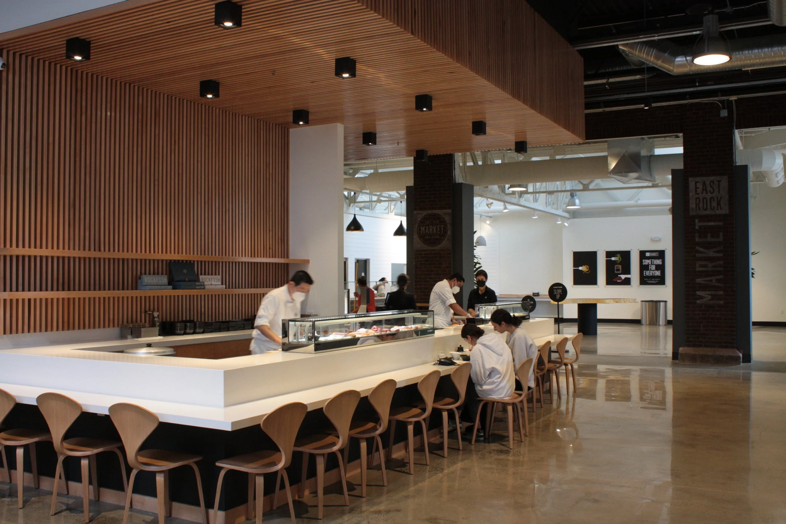 Restaurant Features Marketplace Food Court Sushi Gelato Dessert New Haven Pasta Italian Homepage Japanese Juice Bar Pizza Take Out Opening East Rock Market Opens in New Haven With 5 Exciting Food Concepts James Gribbon December 10, 2021 Sometimes where you live is just where you sleep. Maybe the area has a bit of feel, or maybe some real estate conglomerate slapped it together like processed-cheese-food, named it The Crossing At The Shops At The Superfund Site, and well, at least the commute is short and everyone can understand the urge to show I-95 your personal taillights.In Connecticut’s old – let's be kind and call them historic – cities, there are still to be found that most nostalgic living situation: The Actual Neighborhood. New Haven’s East Rock is one of the latter, and lately, what’s old is new again. East Rock Market opened this November in a space which rubs shoulders with East Rock Brewing Company, and close enough to the in-building gym to borrow a neighborly cup of protein powder. By Thanksgiving of 2021, the Market’s large, bright space housed five concepts: RAW Bowls & Juice, Panciale pasta and pizza, Nicoll Street Gelato, Rick’s Bar, and Rockfish sushi. Developer Rishi Narang has named the former WWI-era Marlin Arms factory East Rock Center, and market, brewery, and gym are all contained within the massive footprint in a sort of indulgence/repentance love triangle. Future plans for the space involve ramen, an Italian deli/charcuterie (The Grazing Goat, after the neighborhood’s other nickname, Goatville) from the owners of Branford’s G Café Bakery, and possibly a taqueria. “We’re open from breakfast through dinner here, and we felt with this town, all the food available, we really had to offer top-end everything,” said Narang. “We also wanted a lower price option so people could come in and eat lunch for seven or eight bucks. This needs to be for everyone.” At the center of the market, in a literal sense, is Rockfish, by award-winning sushi chef Jason Tay, formerly of the Ninth Square’s Miso Restaurant. A destination within a destination, this is where I began my culinary tour.Vanes of blonde wood stretch vertically overhead as I join Rishi and a few other diners at an immaculate white bar, chef Tay already joking and clearly enjoying himself as he prepares “a few things,” he says. The first is a magnificent bento box in slate blue, designed specifically for Rockfish’s delivery and to-go orders. The box, about the size of a laptop, held six pieces of nigiri, as many delicate steaks of Bluefin sashimi, 4 (x2) cut norimaki rolls, a box full of edamame, and servings of soy, ponzu, wasabe, and ginger. A guide (they call it the “Fish Finder”) is printed underneath the lid to help identify each artful bite. The boxes can land in your hands at home, the office, or the Market from anywhere between $30 to $55, depending on what you choose. At the bar, bluefin sashimi is delivered in a small bowl, resting in ponzu sauce and sprinkled with sharp little rounds of scallions. Acid and herbs highlight but don’t overpower the maguro, as they shouldn’t, with what is possibly nature’s perfect protein.Chef Tay’s preparations are notable for his skill with both rice and knife, but I was particularly impressed with the subtlety with which he imparts barely a touch of his personal soy sauce blend on baby Albacore nigiri, with a similarly light hint of wasabi underneath. A pinch of sesame seeds dust and crunch atop seasonal Faroe Island salmon. Sea urchins from Monterrey Bay are globally renowned, but out of season in mid-November. Chef Tay chooses sweet, deliciously creamy Maine uni this time of year, and shows a generous hand with the orange sea-butter. “That comes out of my paycheck,” he laughs. I stand up and walk with Rishi, who tells me Rick’s Bar in the Market is named his father, who worked in wire and cable business and bought the factory in 1991. “He left such a mark here, I wanted to make sure we acknowledged that.” He introduces me to Stanton Lesser who, with his partner, Marty Levine (Martell’s, Fairfield), opened Panciale Pasta in the Market.“Marty’s concept was an all chef-driven place with made-in-house pasta, but served quickly, and at a lower price point,” said Lesser. “He was looking for a home for the concept, Rishi was best man at my son’s wedding, things just came together.” Chef Carlos Rojas is on hand daily to oversee a surprisingly abundant menu. Chef Rojas has spent time in dozens of kitchens, Gramercy Tavern and L’Artusi in New York among them. Full dinners are available at Panciale, starting with antipasti like arugula salad, eggplant ricotta, or the chef’s roasted cauliflower, which is my suggestion to you. The cruciform veg is topped with a multi-herb salmorejo blend and crunchy breadcrumbs before being plated with pesto aioli and Purple Haze chevre, and the combination - plus lemon juice - absolutely zings. I personally like cauliflower, but it’s not always easy to make interesting without heavy handed saucing which quickly loses its novelty. The blend of flavors and textures here was compelling enough I had to remind myself not to fill up: pizza was coming. The Zucca al Taleggio pizza arrives steaming from the oven with squares of butternut squash, sage, sausage spread throughout in the correct crumbles, and lumps of while taleggio cheese crisped to the appearance of perfectly roasted marshmallows against a field of red sauce. Opening a new pizza spot in New Haven is... fraught, especially one close enough to Modern that people eat their apizza as take-out at the brewery next door. From my first bite at Panciale, I knew it didn’t matter: this creative combination worked at every level. The sweet squash was balanced by the spicy sweet umami of the sausage and tomato, bumped up by the herbal sage, and further complimented by the cream and hint of smoke in the cheese. Everything from s