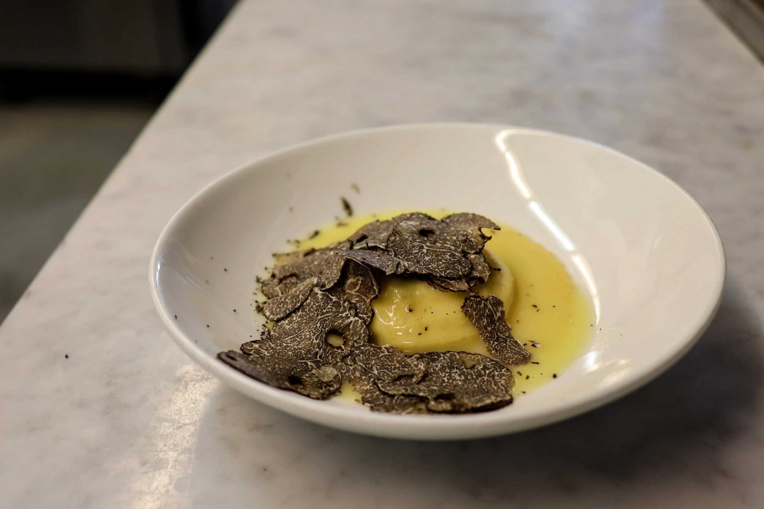 Features Interview Restaurant Pasta egg yolk ravioli Greenwich Byram Rosina's Greenwich Rosina's fresh pasta Homepage Chef Chefs Chef Talk My Favorite Dish: Rosina’s Raviolo al’ Uovo Andrew Dominick December 29, 2022 I’ll be the first to admit that since Rosina’s opened, it has become my toxic trait. And I mean that in the best way possible. I’ve eaten there for dinner, I’ve attended several happy hours and one industry night, and I’ve celebrated a birthday there. Full transparency, Jared Falco, Rosina’s co-owner and executive chef, is a good friend of mine. I’d like to say I go so often to visit him, and that is partially true, but Jared, I’m sorry, it’s for the pasta. Still love you, bro! This year, I think I’ve eaten my weight in ziti with spicy vodka sauce, squid ink malloreddus, tortellini en brood, a few off-menu spaghetti dishes (thanks, chef!), and a few hearty bowls of rigatoni with braised pork and white beans. But it’s the pasta appetizer BEFORE the main pasta dishes that always gets me. It’s creamy ricotta center. It’s got a rich, warm, reddish orange egg yolk runniness when you cut into it. It’s buttery. It’s truffle-y. And the pasta is this perfect balance of silky with a little chew. I’m talking about the raviolo al’ uovo. Each raviolo that are about as big as a souvenir sand dollar and packed as thick as a Reese’s Big Cup with homemade ricotta—a blend of sheep’s and cow’s milk—and an egg yolk as bright as the summer sun. Perfect ball of pasta dough. Keep on scrolling for the process! I’ve tried a few iterations of it, one with leeks, another with salt cured egg yolk shaved on top. Each, though, came out with a fresh shaved black truffle finish. Since it debuted on the menu, I’ve gotten it every single time. And when I’m not at Rosina’s about to have one, it’s the dish I daydream about doing random everyday tasks. Addiction? Yeah. I’m an addict. As if I didn’t appreciate it enough, I asked Jared and chef de cuisine—and one of only two people at Rosina’s that can assemble the raviolo—David Guimares to talk about its inspiration and to take me behind the scenes of how it’s made from start to the part when we all take a yolky, truffle-y forkful of some of the best pasta you’ll have in Connecticut. “It’s inspired by Grant Achatz and this one bite truffle situation that he has,” Falco explains. “It’s like a raviolo that comes on a wonton spoon with black truffle. It’s like a truffle explosion in your mouth. That was what we talked about before we put our version on the menu.” For Falco, the most important part of the raviolo was being able to make it fresh daily being that Rosina’s ethos is fresh pasta, by hand, daily. But he thinks the cheese and the truffle are two very important components to the dish. “We’re not using truffle pate or oil, it’s a real truffle from Urbani and if we don’t use them, we use Nunzia,” he says. “The truffles are what’s key for whipping into the cheese. And we use a three-year aged imported parmesan Reggiano, and a pecorino mixed into the ricotta as well, so it’s got a lot of umami in there.”Guimares then chimed in. “It’s all in the dough,” he says. “It’s a super simple dish. Anyone could make it at home if they had the ingredients. The pasta dough, too. The eggs are important for the texture.”Falco picked up off of that. “If we’re talking semantics and technique, yeah, the dough is the most important part,” he says. “We can tell by looking at pictures now that a certain pasta dough isn’t it. The texture, the way it cooks. You can tell by looking as pasta if they put too much water in it. What type of egg yolks they use, whether they’re dark or light. We experimented with all different kinds of eggs.” Then Guimares started doing his thing on the bench. He calls it a finicky process, but you’d never know it to watch him work. He quickly hand mixes high quality flour with eggs that I won’t even tell you where they’re from in the U.S. as to preserve some secrets. Out comes a smooth, deep yellow, almost orange ball. It’s wrapped, rested, then rolled out a few times for a perfect thickness (or thinness, rather). That ricotta truffle mixture is piped down like a snake with an emptiness meant to house a golden yolk. Another pasta sheet is placed over top of that one before each raviolo is cut and lightly dusted with semolina. From there it’s a straightforward cook. Frying pan on a high flame, salty pasta water, and butter. The raviolo gets shimmied around and basted for barely a couple of minutes, then it’s placed into a shallow dish, a few spoonful’s of that pan butter/salt water mixture over the top, and before it hits your table, a liberal shaving of pungent black truffle. Cut into it with your fork, the yolk oozes out, scoop it up shovel style as to get plenty of truffle in each bite. It’s bliss. Big thanks to Jared and David for fulfilling my raviolo curiosity. But my obsession, my constant craving for their raviolo al’ uovo? After the behind the scenes look at the process, I have more appreciation for it, and my hankering for it is bigger than it ever was. One for the ‘gram Finito!
