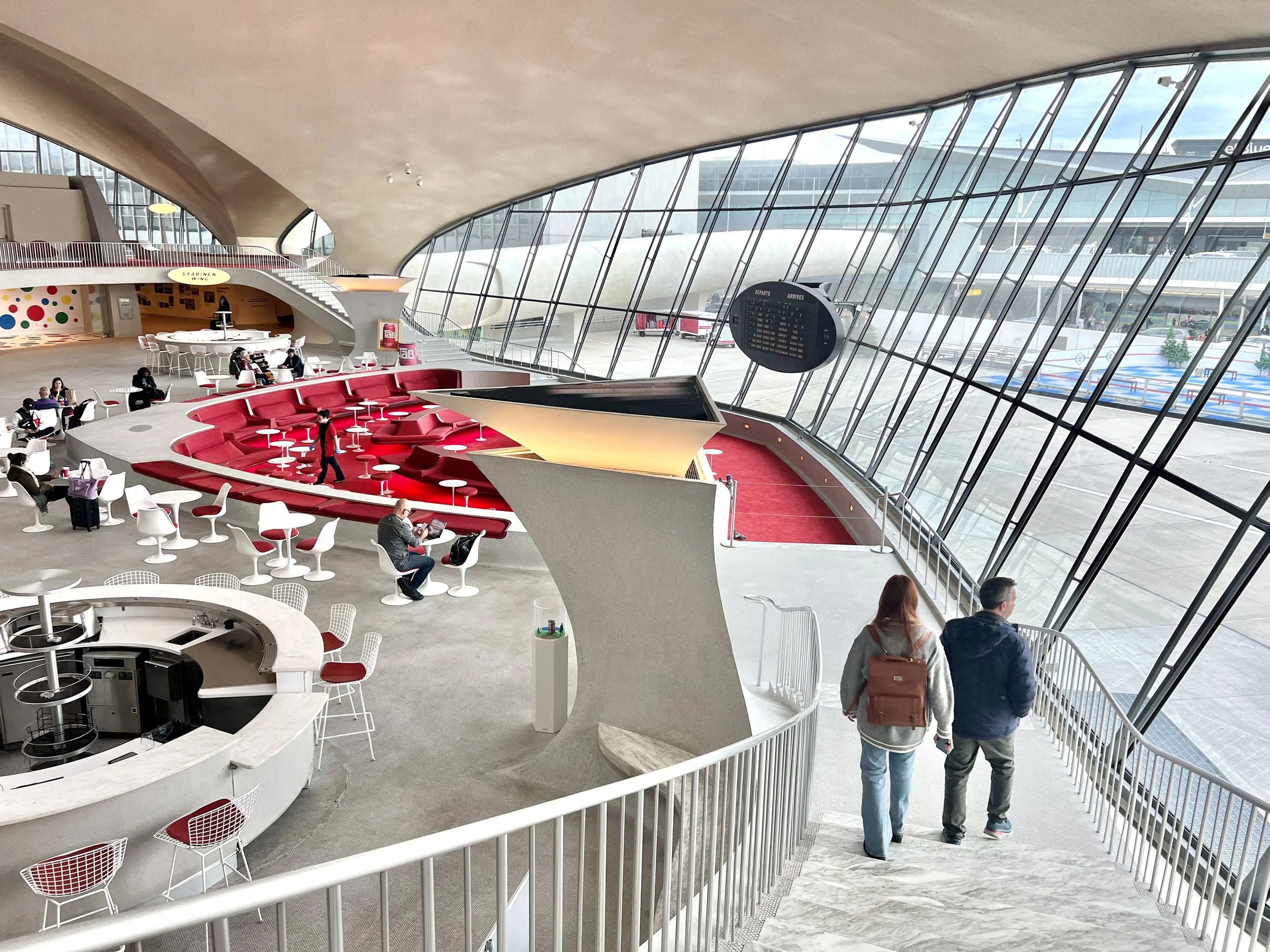 Restaurant Features Travel Road Trip Hotel JFK Airport Breakfast Lunch Destination: TWA Hotel and Paris Café by Chef Jean-Georges Vongerichten at JFK airport ellen bowen April 19, 2023 Looking for a unique staycation or an overnight in NYC before an early morning or late night flight? Then the iconic Eero Saarinen designed TWA terminal and TWA Hotel at John F Kennedy Airport offers visitors a trip (before the trip) down memory lane back to the 1960’s, to when the TWA flight center first opened in 1962. TWA filed final bankruptcy and the TWA terminal closed in 2001. The building remained empty until Morse Developers along with MCR Hospitality purchased the building and added 500 rooms in two hotel towers and reopened as the TWA Hotel in 2019. Trans World Airlines or TWA was owned until the 1960’s by reclusive billionaire, Howard Hughes, who gave celebrated architect, Saarinen free rein on the design and no budgetary constraints. What was designed and built in 3 years is a modern architecturally significant building designated on the National Register of Historic Places in 2005 and LEED certified in 2020, featuring curving walls, staircases and ceilings, recessed lighting, long tube like hallways, all enhanced with carpeting, seating and accessories in the TWA signature red called “Chili Pepper Red”. An overnight stay includes access to the rooftop infinity heated pool and Après Ski styled Pool Bar and Café. Plush robes are in every room and the pool is open year round untill10:30 pm and is a fun experience overlooking the runways as you sit in the “poolcuzzi” sipping a cocktail and watching the planes take off or land. The actual hotel rooms are small, with limited amenities, mostly overlooking the terminals, but in the vintage 60’s style including a rotary dial phone and a famous Saarinen womb chair, but it is the hotel and its hidden alcoves (like the Pope’s Room and Ambassador Club) that make the TWA Hotel not your typical hotel stay.HIGHLIGHTS:Original entrance and original Solari Flight BoardSunken Lounge and BarThe “Connie” Bar- an original Lockheed Constellation plane that was taken out of its retirement in Maine and transported by trailer to the TWA site. Read the story of “Connie” in the hallway to Saarinen Wing. The Pope’s Room- Where the pontiffs, who only flew TWA waited for their flights. They referred to TWA as “Traveling With Angels”. Gallery of uniforms featuring designs from 1944-1955 by Howard Greer to Valentino in1971-1975 to the final design by Ralph Lauren 1978-2001.Rooftop pool and Pool BarLobby Intelligentsia Coffee Bar and Food Hall featuring light fare and Mr. Softee Ice Cream The Paris Café by Chef Jean-Georges Vongerichten is located in its original location up the curving staircase on the mezzanine level. The open kitchen and cozy banquet seating makes this a casual yet elevated dining experience. Cocktails are well curated including a Ginger Margarita with Cointreau, ginger and lime, Raspberry Lychee Bellini and Black Cardamom Boulevardier with bourbon and Campari. Wine is available by the bottle or the glass.The dinner menu is well designed to appeal to both the casual traveler or the destination food lover. Our dinner for six gave us the opportunity to select from the menu something for everyone. The knowledgeable server and General Manager shared that this was the first night of the new Spring menu, and it did not disappoint. We started sharing a classic Caesar Salad, Crispy Calamari with a light salsa verde, and Meatballs in a chili tomato ragu topped with parmesan cheese and accompanied by grilled artisan bread.Crispy salmon sushi with a soy glaze and Yellowfin tuna Tartare and half roasted Cauliflower in a turmeric tahini were also offered. Entrees we selected included a Hake Fish and Chips, which was lightly battered and served with thick sidewinder chips and tartar sauce.A thick and juicy Cheddar Cheeseburger came with lettuce, tomato, yuzu pickles and frizzled onions.And came with an order of fries. Our favorites were the Parmesan crusted organic chicken which was over artichoke hearts in a light lemon basil butter and pea sprouts. The Poppyseed crusted Salmon, came with glazed carrots in a coconut carrot sauce and white quinoa. Both of these dishes were delicious and perfectly prepared.A side order of grilled asparagus and spring peas in smoked butter and mint completed the dining experience. Desserts included Bittersweet Chocolate pudding, Warm Chocolate Cake, Passion Fruit Sundae and a homemade warm Rhubarb Tart Almond Cake. While Paris Café is a dining experience that can stand on its own, if you choose to spend the night, an après dinner swim and nightcap in the Pool Bar can make for a really special 24 hours.TWA Hotel1 Idlewild DrTerminal 5JFK Airport, Queens, NY 11430