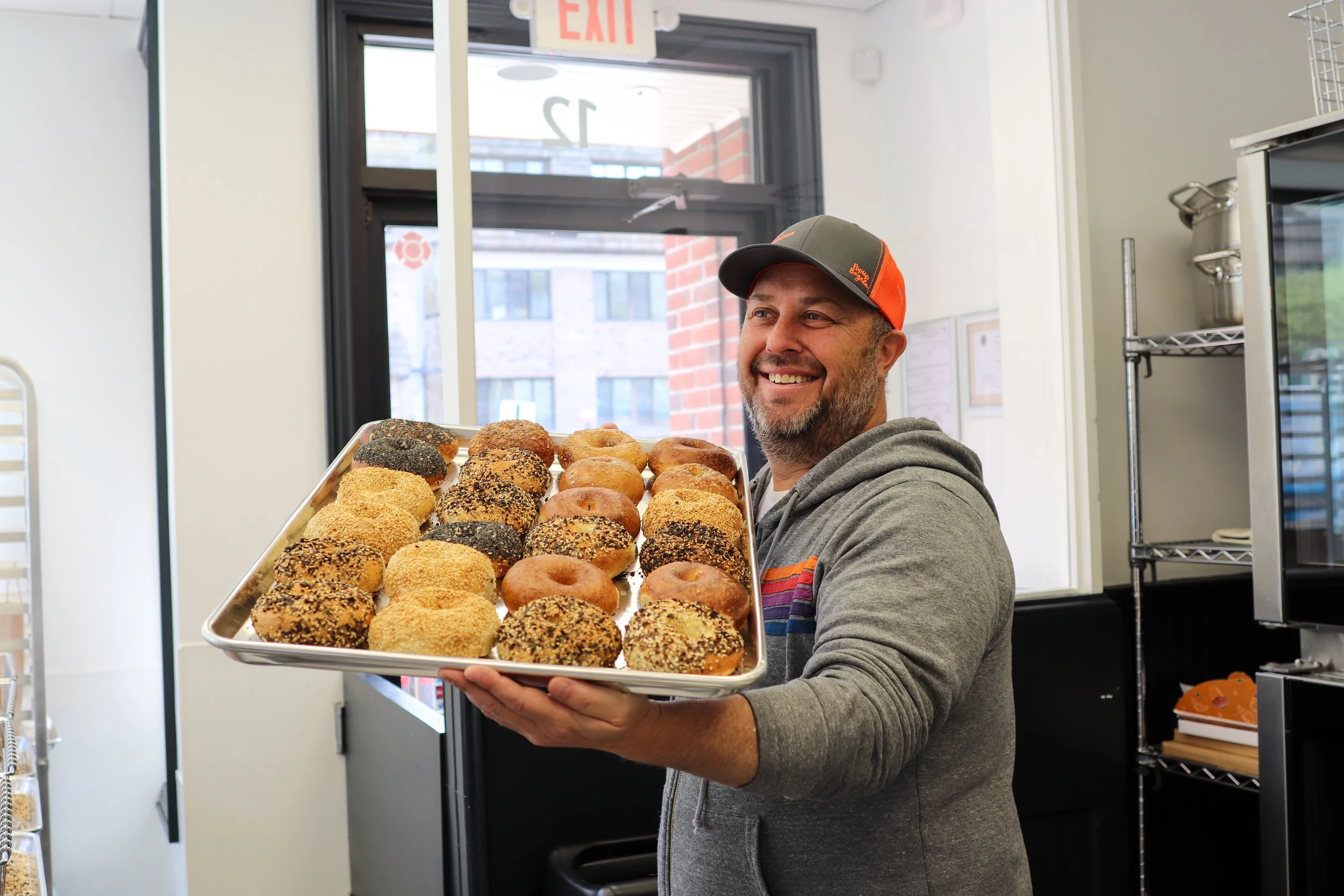 Features Interview Bagels PopUp Bagels Greenwich Homepage Interview PopUp Bagels Opens in Greenwich and More Expansion News Andrew Dominick May 19, 2023 Sesame and poppy are two of the five bagels offered. The other three are everything, salt, and plain. What began as a pandemic bagel baking hobby for Adam Goldberg has increased tenfold, and that’s putting it very lightly. PopUp Bagels kicked off three years ago when Goldberg and his cousin Jeff Lewis started making bagels for family and friends. Rave reviews led Goldberg to launching a backyard preorder pickup bagel biz that sold out time and time again. PopUp would then take their bagels on the road and popped up (hence the name) at Fairfield County restaurants like Marcia Selden Catering, Bill Taibe’s Don Memo, and Bar Rosina’s (formerly Rosina’s), just to name a few. How popular were Goldberg’s crusty on the outside, light on the inside, CHONKY (that’s chunky but thicker) bagels? They often sold out in mere seconds. But with popularity, expansion is inevitable. Over $2 million worth of expansion, in fact. Adam Goldberg coats boiled bagels in sesame seeds before they hit the oven. The only thing he’s changed since the PopUp Bagels expansion involves the fermentation time of the yeast dough. “We used to make the dough in a mixer at 3 a.m. on the day we were selling it,” he says. “Instead, all of dough is made a day or two prior and we cold proof it. The cold proof has helped our crust and our crumb.” “That money is helping to seed our growth,” Goldberg explains. “We got about $2.5 million. The money is from some very experienced people in the industry. We’re gonna use it to build out a production facility so we can increase our production without losing any quality, as well as funding the opening of three or four stores this year. Eventually, we’re looking to either franchise or branch out to grow the brand nationwide.”Those “experienced people” Goldberg mentioned is a group led by John Davis, the Hollywood produced and known food entrepreneur who has backed companies like Wetzel’s Pretzels, Dave’s Hot Chicken, and Blaze Pizza. Along with Davis, other backers include names you may know like Paul Rudd, Michael Phelps, Michael Strahan, and J.J. and T.J. Watt. On the day we stopped by the Greenwich spot, the schmears were veggie cream cheese—best described as the best vegetable dip you’ve ever had, like seriously, you could dip chips in this—and strawberry butter. Look out for seasonal spreads like ramp butter and cream cheese, and off the cuff stuff like Lucky Charms butter. The infamous Dr. Schmear, aka Richard Martin, who makes all the wonderful spreads that compliment the bagels. And that brand—if you don’t already know what PopUp Bagels is all about—are fresh bagels, served to the customer piping hot, NOT pre sliced, and artisan schmears. All ordering should be done online, 24 hours or more in advance to secure your dozen bagels and two schmears. Combine a smart business plan with funding, plus plenty of recognition in the media, popups with industry giants Danny Meyer and Jean-Georges Vongerichten, and back-to-back Brooklyn Bagel Festival wins (People’s Choice for Best Bagel) against New York City’s best bagel shops, and growth is coming, and it’s coming as soon as right now. We got in on some of the bagel making action, too. For those wondering about walk-ups, here’s the deal: They make 10-20 dozen extra bagels for that purpose on Friday, Saturday, and Sunday. Individual bagels are not sold, so, no, you can’t just buy one. The minimum for walk ups is six bagels and one schmear. And no, they don’t make sandwiches, but you can purchase cream cheese, butter, lox, and trout roe. Take it all home and DIY! This baseball season, PopUp Bagels made its debut at Citi Field’s K Korner under the name PopUp Pizza Bagels (what they’re serving should be self-explanatory), and they’ve furthered entered the NYC market with a brand new store in Manhattan’s South Village area at 177 Thompson Street. And before PopUp Bagels landed in the Big Apple, they opened a 350 square foot bagelry in the Glenville section of Greenwich where you can preorder, choose a time slot, and swing by the pickup window to grab your bag of hot bagels.A mobile oven is being built, too, for events both public and private. “We’re building out a mobile oven so we can boil and bake on site,” Goldberg says. “I want to be clear, though, it’s not a food truck, it’s a portable oven. We’ll be attaching an oven to a trailer so it’s mobile. Our first use of it will be at this year’s Greenwich Town Party.”As far as if popups will remain a thing going forward, fear not, they’re not going away. “We’re going to continue popups because it’s how we entered the market,” Goldberg says. “We’re focusing on the new stores in Greenwich and Thompson (in the city) for now. The Westport and Redding pickups are still going great, and we have a great relationship with Captain Marden’s Seafoods in Wellesley, Massachusetts where we do 70-100 dozen bagels every weekend that always sell out. The first weekend in May, we’ll start in East Hampton.”For now, Goldberg is psyched to be in Greenwich and for the overall expansion of his brand. He mentioned that he’s chatted with customers who’ve driven a half hour or more to get PopUp Bagels from the Glenville neighborhood pickup window, and before the Manhattan store opened, many of his customers made the trek from the city. So what’s all that mean? Well, you never know where the next location might…pop up. If they see where people are coming from, there’s a chance a PopUp Bagels might open near you. https://www.popupbagels.com/
