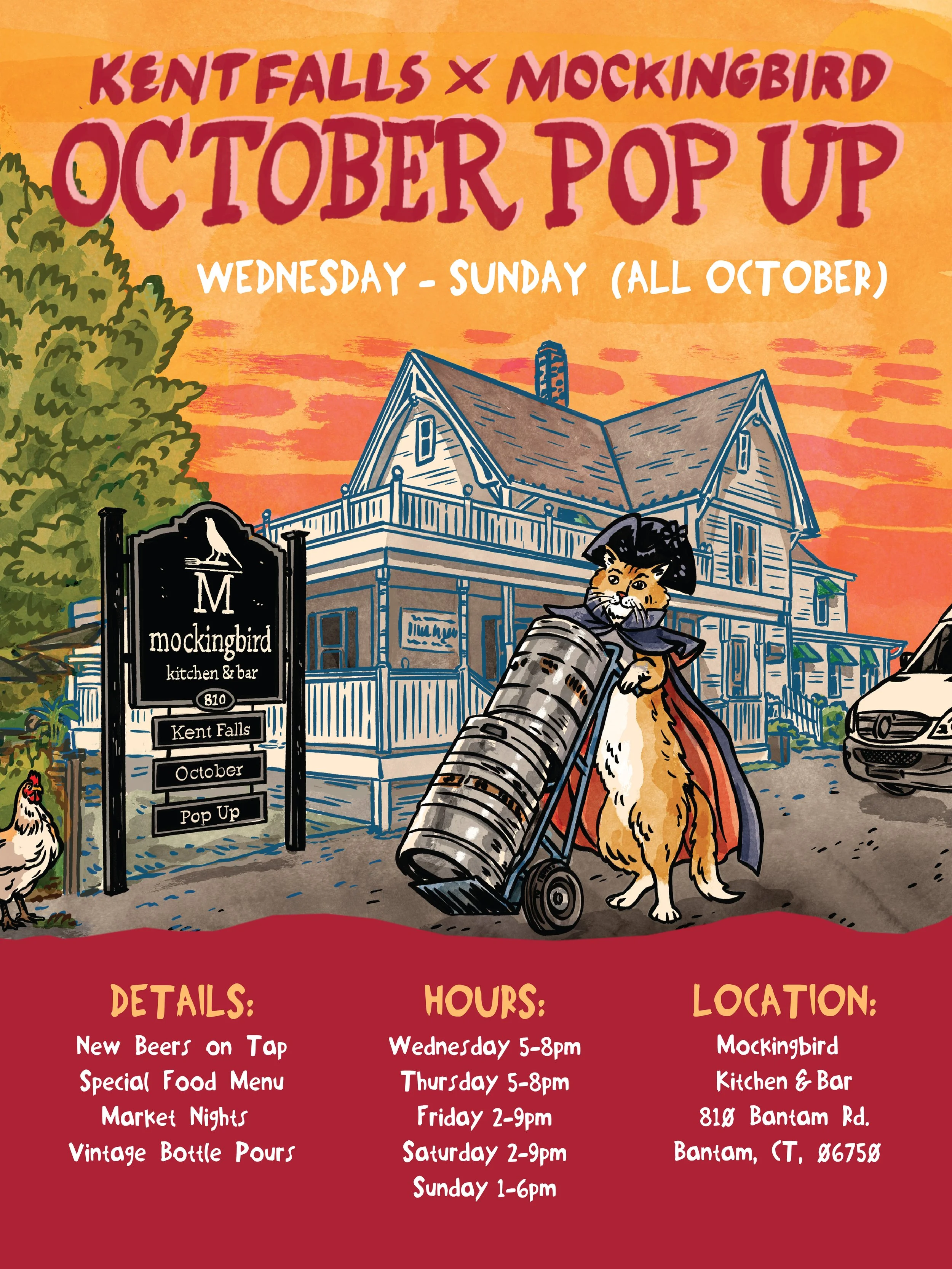 Features Pop-Up Beer Brewery Kent Falls Brewery Pops Up At Mockingbird Kitchen Litchfield James Gribbon September 28, 2023 Chef and owner Samantha Tilley of Mockingbird Kitchen & Bar in Litchfield says she draws inspiration for their menus from the Northern Mockingbird, who masters a wide variety of bird calls, to create a global culinary offering showcasing the bounty of their nearby Tenth Acre Farm and northwestern Connecticut. It’s a natural fit for this October’s partnership with Kent Falls farm brewery, which will run all month long.Kent Falls will have their team on hand pouring beers, while Sam and her squad run the kitchen and turn out some incredible food from a special October menu. Events will include the first “Thursday Night Market” in over a year, with a local seafood monger (To The Gills) shucking oysters, a cheesemonger (New Curds On The Block) offering local cheeses to enjoy on site or take home, and one of the pair’s favorite local bakers (Beau Noir) selling fresh goods.“Sam from Mockingbird was excited by the idea of collaborating on an event, and while discussing the challenges and limitations our brewery’s tasting room has faced this year the idea came about to collaborate on a month-long tasting room experience during peak season around the farm,” Kent Falls head brewer Barry Labenz told us at CTBites.There will be some other events, including new beer releases every week to be announced as the popup rolls along. A Kent Falls gueuze (a blend of 1, 2, and 3 year old lambic sours), and an apple aperitif barrel aged Multiverse stout, in partnership with Neversink spirits in nearby upstate New York, are the first offerings currently at Mockingbird.The Kent Falls tasting room will stay open, operating as they have all year with small pours/flights as the on-site option. Cans/bottles will be available for purchase to-go at both locations.Kent Falls Brewing Co.33 Camps Rd., KentKentfallsbrewing.comMockingbird Kitchen & Bar810 Bantam Rd., Litchfieldmockingbirdkitchenandbar.com
