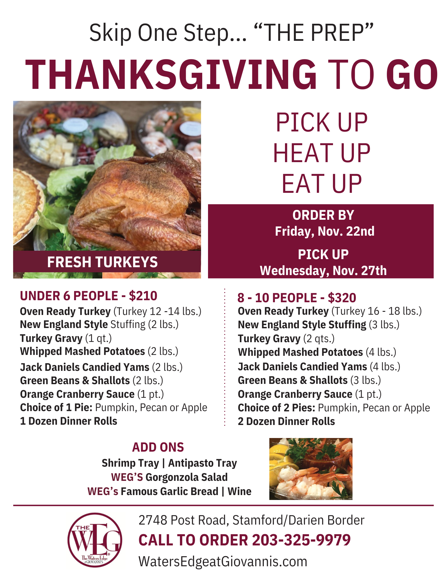 Features Thanksgiving Holiday Caterer Catering Take Out Homepage 100+ CT Restaurants, Caterers & Farms for Thanksgiving (2024 Edition) Carly Terzigni November 15, 2024 Thanksgiving is right around the corner, and restaurants across Connecticut are preparing countless turkeys and pumpkin pies to serve you and your family. Whether you’re preparing a meal at home or you’ve decided to visit your favorite local restaurant, there are tons of businesses that are hard at work to make sure your Thanksgiving is the most memorable one yet.From roasting a whole turkey yourself to heat-and-serve meals to a fully-plated multi-course meal served at the table, you can find your level of Thanksgiving exertion among the restaurants in this roundup. Time is running out, so don’t delay – order your Thanksgiving dinner or book your reservations today!For your convenience, the guide is organized by county – simply find yours to see what local options are available! We have also made note of which locations are providing Vegan options this year. And, finally, if you want to pick up a fresh turkey to cook at home, there is a section devoted entirely to Connecticut farms at the bottom of the guide.Fairfield CountyAmber Room Colonnade-Danbury www.theamberroom.netLet The Amber Room Colonnade take the stress out of your holiday! Enjoy a delicious, hassle-free Thanksgiving meal for 6-12 guests featuring turkey, gravy, sausage stuffing, cranberry sauce, mashed potatoes, veggies, macaroni and cheese, salad, dinner rolls, and dessert, all for $435.00 plus tax. They also offer a smaller option for 4-6 guests at $350.00 plus tax. Customize your meal with additional side dishes available a la carte. Place your order by calling 203-748-3800 before 5:00pm on Friday, November 22nd. Pickup will be from 12:00pm to 2:00pm on Wednesday, November 27th, with reheating instructions included. The Amber Room wishes you and your family a warm and joyful Thanksgiving!Jacob’s Pickles-Norwalk https://www.jacobspickles.com/Make Your Reservations Today for Jacob’s Pickles South Norwalk's Thanksgiving Feast. This is a long-standing tradition for the Jacob's Pickles in New York that's now being offered in their Norwalk location. Jacob’s southern-inspired, family-style Thanksgiving feast features multiple courses, all your favorites (and more!), a spirited atmosphere, and best of all - no fussing! $85 prix fixe includes: Buttermilk Biscuits with Maple Butter, Pickles for the Table, Pumpkin Soup, Roast Turkey, Buttery Whipped Potatoes, Cranberry Sauce + Rustic Gravy, Apple Cranberry Stuffing, Jacob’s Famous Mac & Cheese (add green beans almondine for the table $14) and a Pumpkin Cheesecake Jar for Dessert.Dine-in Reservations: https://bit.ly/ThanksgivingJacobsThanksgiving To-Go (extended menu items): https://bit.ly/ThanksJacobPickupPalmer's-Darien https://www.palmersdarien.com/Palmer’s Thanksgiving menu has everything you need to make your holiday easy and delicious! Focus on family, not cooking! Reserve a fresh turkey, or for something more unique, try their Turkey Wellington with cranberry bacon stuffing with luscious wild mushroom duxelles, all wrapped up in puff pastry. Of course, their award-winning bakery also offers house-made classics like pumpkin and apple pies. Start your celebration with one of their beautiful cheese platters or fruit skewers. Ordering closes on November 22nd at 5 p.m. www.palmersdarien.com/order-online-holidayÀ Table-Ridgefield https://www.atableus.com/À Table's extensive Thanksgiving menu offers something for everyone, making your holiday meal stress-free and delicious. They feature whole-cooked turkeys, perfect for feeding a crowd, as well as the option to order sliced turkey by the portion, ideal for smaller gatherings or those looking to customize their meal. Be sure to place your order by the deadline of November 20th to ensure availability. All orders, except for whole turkeys, will be ready for pick-up on Wednesday, November 27th, giving you plenty of time to prepare for the big day. If you're purchasing a whole-cooked turkey, you have the added convenience of picking it up fresh on Thanksgiving Day. Let À Table help make your Thanksgiving feast memorable!AMG Catering-Wilton Let AMG Catering take the stress out of your Thanksgiving feast this year. They truly mean a stress-free Thanksgiving: you can even order your turkey pre-carved this year (additional fee applies). Fresh herbs and pan gravy are also included. In addition to the turkey, you can order an array of classic side dishes, including Cornbread and Cranberry Stuffing, Sweet Mashed Potatoes, Creamy Mac and Cheese, and more. Of course, you can’t forget desserts like Pumpkin Pie, Apple Pie, and seasonal Cupcakes. The minimum order size is 20 people, and the order deadline is November 18.Aux Delices-Darien, Greenwich, Riverside, Westport https://auxdelicesfoods.com/Make your holiday stress-free, and let Aux Delices do the cooking! They can prepare your entire meal or any portion of it. It can't get any easier than one of their "Thanksgiving Made Easy" price-fixed meals, which has everything you need for an 8-10-person celebration. They even have an option for your meal to be picked up hot and ready to serve on Thanksgiving day! Choose delicious starters, such as Four Cheese Arancini, Fall Squash Soup, or Coconut Crusted Shrimp, and side dishes, such as Creamed Spinach, Potato Gratin, and Roasted Fall Squash to accompany their all-natural Fossil Farms turkeys. Don't forget to order one of their delicious Apple, Pumpkin, or Pecan pies or a festive Chocolate Turkey Cake for a sweet ending to your meal! Place your orders at auxdelicesfoods.com by Saturday 11/23.Cherry Street Cheese & Provisions-New Canaan https://cherrystreetcheese.com/Cherry Street Cheese & Provisions has curated a Thanksgiving menu that will have your family talking about this meal for years to come. Known for their selection of artisan and farmstead cheeses, Che