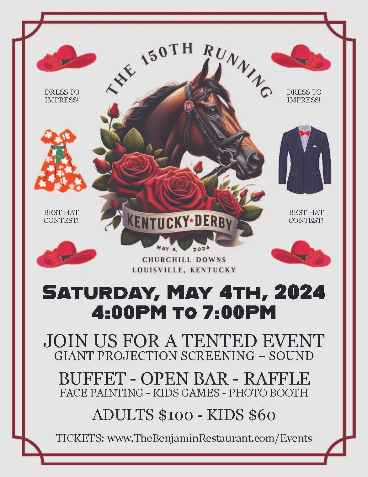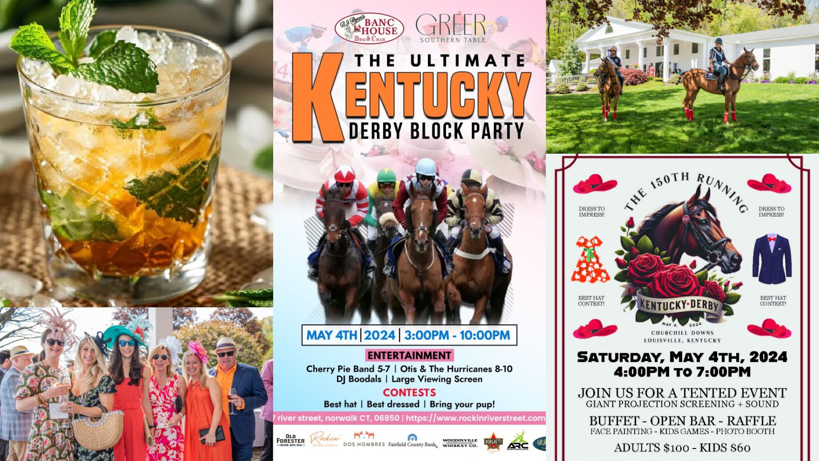 Features Holiday Kentucky Derby Guide To Kentucky Derby Events & Parties in Connecticut (2024 Edition) Carly Terzigni April 25, 2024 This year marks the 150th Running of the Roses at Churchill Downs. The Kentucky Derby is known as the most exciting two minutes in sports, and businesses across Connecticut will host viewing parties on Saturday, May 4th to make sure you can enjoy the action. Derby-themed food, mint juleps, and more will be available throughout the day at several restaurants around the state. Make sure you don your fanciest hat – many restaurants are holding contests! Some events are fun for the whole family, while others will have age restrictions, so make sure to double-check ahead of your Derby Day festivities.BJ Ryan’s BanC House and Greer Southern Table-Norwalk https://www.bjryansbanchouse.com/https://www.greersoutherntable.com/Rockin’ River Street presents THE ULTIMATE DERBY BLOCK PARTY! River Street will be CLOSED to make room for the best Derby party in town! Featured locations include BanC House and Greer Southern Table for food and specialty drinks, including classic Mint Juleps, of course! The party starts at 3 pm and goes until 10:00 pm with live music and entertainment on their Wall Street Stage and a view of the races from a large screen prompter. Contests for Best Dressed and Best Hat so be sure to dress to impress! This event is pup-friendly, too! Catch the Cherry Pie Band from 5:00 pm - 7:00 pm, Otis & The Hurricanes from 8:00 pm - 10:00 pm, and a live DJ!The Benjamin-Ridgefield https://thebenjaminrestaurant.com/Join The Benjamin for the 150th Running of the Roses!! Come join them for a day filled with excitement and horse racing at The Benjamin! Prepare to sip on mint juleps, win prizes, and watch the thrilling Kentucky Derby race unfold. The event will be held at 20 West Ln at The Benjamin Restaurant, so make sure to mark your calendars and gather your friends and family for a fun-filled day. Tickets include a buffet and an open bar. In addition, there will be face painting, balloon animals, games, raffles, a photo booth, and more! This is a tented event with hopes that the lawn will also be open, weather permitting, to soak in the sun! A 25-foot blow-up movie screen with a laser projector will stream the race live with sound. ADULTS $100 - KIDS $60.Ron Foley Foundation-West Hartord https://www.ronsrun.org/It’s time to don your Derby Day best for the 15th annual Ron’s Run for the Roses! The Ron Foley Foundation is thrilled to announce its annual Derby Day fundraiser will take place on May 4th from 2:30 to 7:30 PM at the Farmington Polo Club. All proceeds from the event will benefit the Foundation's mission to promote early detection and awareness, and raise funds for pancreatic cancer research and patient aid. Guests at Ron's Run for the Roses can expect an afternoon filled with southern fare, refreshing mint juleps, lively music, and an array of exciting activities, including live and silent auctions with unique items and experiences up for bid. The highlight of the evening will be a live viewing of the Kentucky Derby on a big screen. For tickets or more information, visit www.ronsrun.org. Aquila's Nest Vineyards-Sandy Hookhttps://www.aquilasnestvineyards.com/Join Aquila’s for their Derby Day Hats & Croissant Wine Brunch on Friday, May 3rd at 12 PM. Come dressed in your best Derby Day hats and enjoy freshly baked croissants by Uncle Matt's Bakery and some of Aquila's Nest delicious wine, along with delicious food from one of our food trucks! More info available here. Back 9 Social-Wallingfordhttps://www.back9social.com/Enjoy the Kentucky Derby at Back 9 Social Doors open at 5:00 pm and the cost is $75 per person. Kentucky Derby Style Dress is the requested attire. Enjoy Kentucky Derby-themed food, mint juleps, best hat contest, and more!The Blind Rhino-South Norwalk, Black Rockhttps://www.theblindrhino.com/The Blind Rhino will be the SPOT to watch the Kentucky Derby! Every one of their 28 TVs with sound will be available, plus juleps & menu specials! Be sure to wear your biggest hat!Bobby V’s Restaurant-Stamfordhttps://www.bobbyvsrestaurant.com/Join Bobby V’s for the greatest two minutes in sports. Doors open at 10 AM on Derby Day; reservations are recommended. Bar seating, front restaurant dining, and wagering carrels are first come, first serve. Bobby V's will be 21+ on race days.The Estate-New Havenhttps://theestatenewhaven.com/Enjoy an open bar with festive cocktails, hors d’oeuvres, dessert, and live music, while the Derby is streamed live beneath their sailcloth tent. Showcase your finest and most fashionable Derby attire to compete for the title of “Best Dressed” and “Most Stunning Hat or Fascinator.” Event takes place on Derby Day from 5:00 pm - 8:00 pm; Tickets are priced at $125 per person; learn more here!FanDuel Sportsbook at Mohegan Sun-Uncasvillehttps://mohegansun.com/Mohegan Sun FanDuel Sportsbook is the place to be to watch the 150th Kentucky Derby Party! Don’t have time to make it to the racetrack? No worries! You won’t miss a second of the action on the 140-foot video wall, the largest in the Northeast! The event takes place from 10:00 am - 7:00 pm. More info available here.Hidden Acres Farm-Naugatuckhttps://www.hiddenacrestrc.org/Hidden Acres Farm is hosting its 5th annual Kentucky Derby party at Naugatuck Lodge of Elks #967 (note the new location!) on Derby Day from 4 pm-8 pm. The event includes live music, food, a cash bar, dancing, and more. Tickets start at $60 pp.Hops Company-Derbyhttps://www.thehopscompany.com/Saddle up for our Kentucky Derby Event! Pre-game “the most exciting 2 minutes in sports” with Hops Company. They will have a full day starting with live music from Bobby Wheeler, followed by a live DJ, frozen drinks, giveaways, and their annual Hat Contest. Doors open at 12:00 pm. FREE ENTRY!Jazzy’s Cabaret-New Havenhttps://www.eventbrite.com/e/the-upn-presents-kentucky-derby-watch-party-i