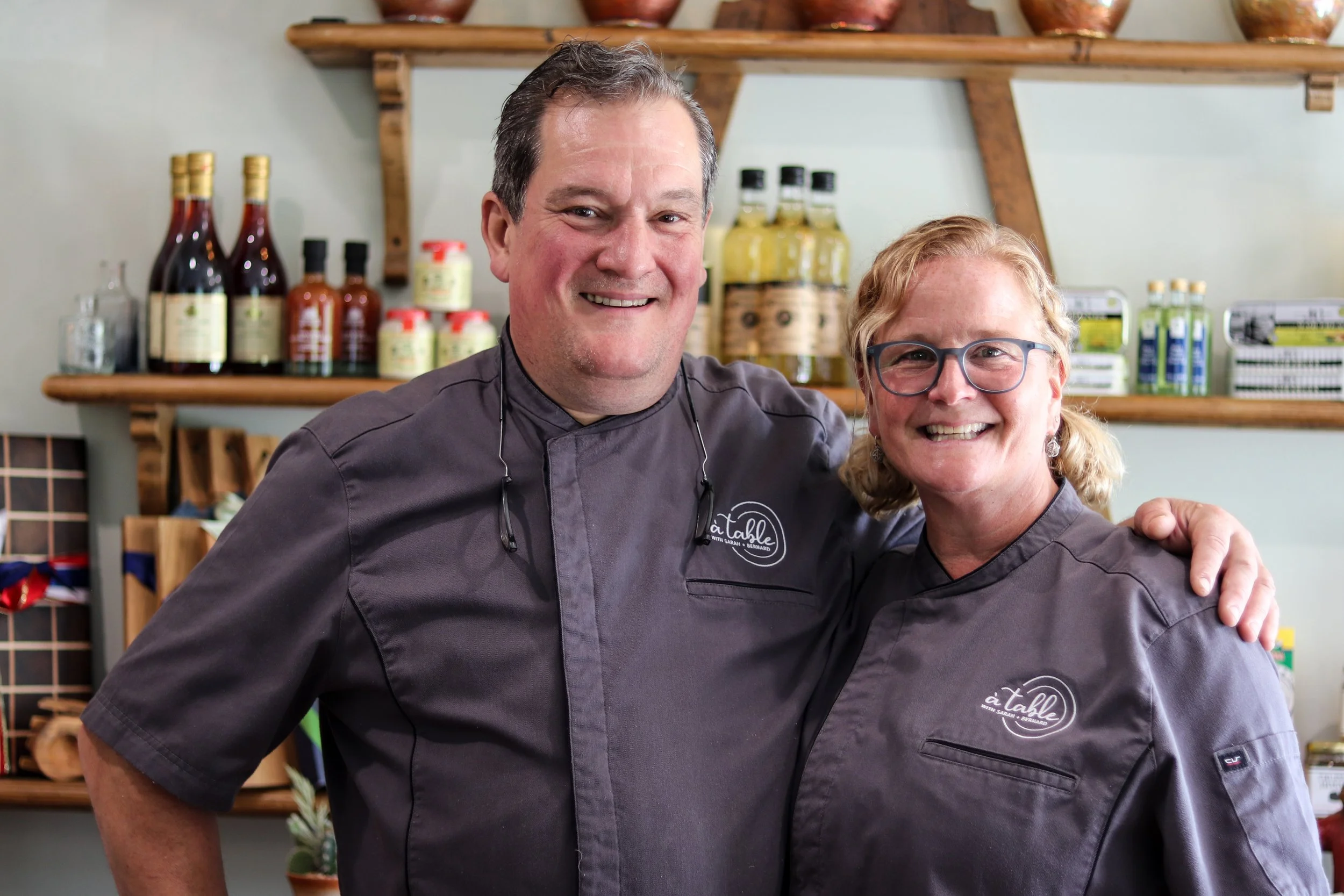 Features Ingredients Interview Gourmet Market Ridgefield Homepage Interview Market Sarah & Bernard Bouissou Open À Table, a Gourmet Market in Ridgefield Andrew Dominick August 11, 2024 “One of the things we hear all the time is, ‘We had no idea you were here!’ And once they’re here, they always come back.” For over 20 years, Ridgefielders and those way further out knew exactly where to find Sarah and Bernard Bouissou—at 20 West Lane, where they not only operated a successful, iconic French restaurant, Bernard’s Restaurant and Sarah’s Wine Bar, but it’s also where they lived and raised a family. When they sold the property in 2022 to Rob Moss, Dave Studwell, and B.J. Lawless, who would open The Benjamin in its place in 2023, Sarah and Bernard only halfway left Ridgefield. The couple, who’ve been married nearly 34 years at press time, moved up to Sherman, happily traded in long days and late nights at the restaurant, and almost promptly opened up a gourmet market called À Table. Aside from just gourmet foods, you’ll find some locally made décor, floral arrangements, and tabletop liners, cloths, aprons and the like, all extras that the market decided to carry after being inspired following a trip to France. “The guys (Moss, Studewell, and Lawless) fell in love with the place and they’re the kind of people we wanted to sell it to,” Sarah says. “They wanted to make it better.”Bernard picks up, “They’re doing a good job.”“À Table (pronounced Ah TAH-bluh) means ‘come to the table,’” Sarah says. “Our hope is that we can make it easier to come to their table by just coming here and picking it up. Everything has heat and serve directions and you can have a beautiful meal in 10 minutes that’s fresh and easy while feeding yourself and your family good products.” Sarah and Bernard met when they were 21, when both cooked at Le Cirque under Daniel Boulud and have worked together ever since. Approaching 34 years of marriage, Sarah jokes that the key to making it work is, “He does everything I say! Just kidding! We’ve been good at playing to our strengths. I’m more social and in the front, Bernard is a machine in the kitchen and his culinary skills are ridiculous. We have fun.” And make no mistake, À Table isn’t a deli, even if at first glance it may resemble one. They’re not slicing cold cuts behind the counter or assembling Italian combos. And there are no tables inside or outside anyway. À Table is prepared foods, imported French goods, homemade pastries and desserts, fresh baked sourdough, homemade pastas, sauces, dressings, chef-driven frozen dinners, homemade sausages, and then some. “We probably had 15 things in the case when we opened, now we fight to fit more!” Sarah says. “Bernard is constantly doing new things. Porchetta, rabbit porchetta, and all those things that keep us interesting.”“All the ice cream is made in house, all the sausage, pasta, ravioli, mac and cheese, lasagna, classic French dishes,” Bernard says. “We have three or four different terrines, pate. Even smoked foie gras terrine, spicy lamb merguez sausage, chorizo, porcini and pork sausage.” What’s in the case really has a range. You’ll find grain salads, chateaubriand, roasted veggies, chicken tenders for the kids (or the adults that also love them!), sesame crusted salmon, paninis that you can press yourself or they’ll gladly do it for you, and Bernard’s popular veal burger that was a big seller at the restaurant years ago. “We’ve done porchetta panini, another with coulotte steak with spiring onion and mushrooms, another with leg of lamb with peppers, onions, and Manchego cheese,” Bernard says. “We served this veal burger at the wine bar. Everything lends to taking it to-go and finishing yourself. If you get the burger, heat it to the instructions, it’s a perfect medium rare.” Sarah chimes in, “We spent a lot of time getting all the reheating instructions right.”Prepared food aside, you’ll also find fancy vinegars—some aged in Cognac barrels—condiments, truffle oils, honey, and tinned fish, but they’re not forgetting some local goods sprinkled in the mix as well. “When French people find us, they’re really happy,” Sarah says. “We get a lot of our imported goods from The French Farm, but we also have thoughtful, special, unique local stuff that you won’t find everywhere like décor from Forage & Florals based in Ridgefield and spectacular flowers from Wild Iris in Ridgefield.” Now over a year in at À Table, Sarah mentioned that people have inquired about them putting tables outside—and they’re not going to do that, nor are they considering selling alcohol. Her and Bernard defer to their neighbor, 109 Cheese & Wine. And if they do miss the restaurant, they’re scratching that itch by having a full catering business. But one thing they’re possibly open to are classes. “We were a restaurant for so many years, so we’re not doing tables or table service,” Sarah says. “People have asked about cooking classes. We’re one year in, so I’m sure we’ll do different things. You never know. I like that we close at 6!”109 Danbury Road, Ridgefield203.438.8282, atableus.com