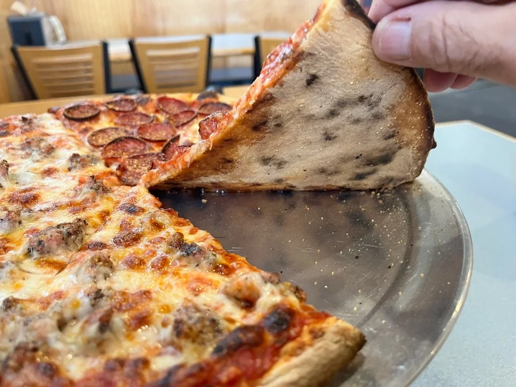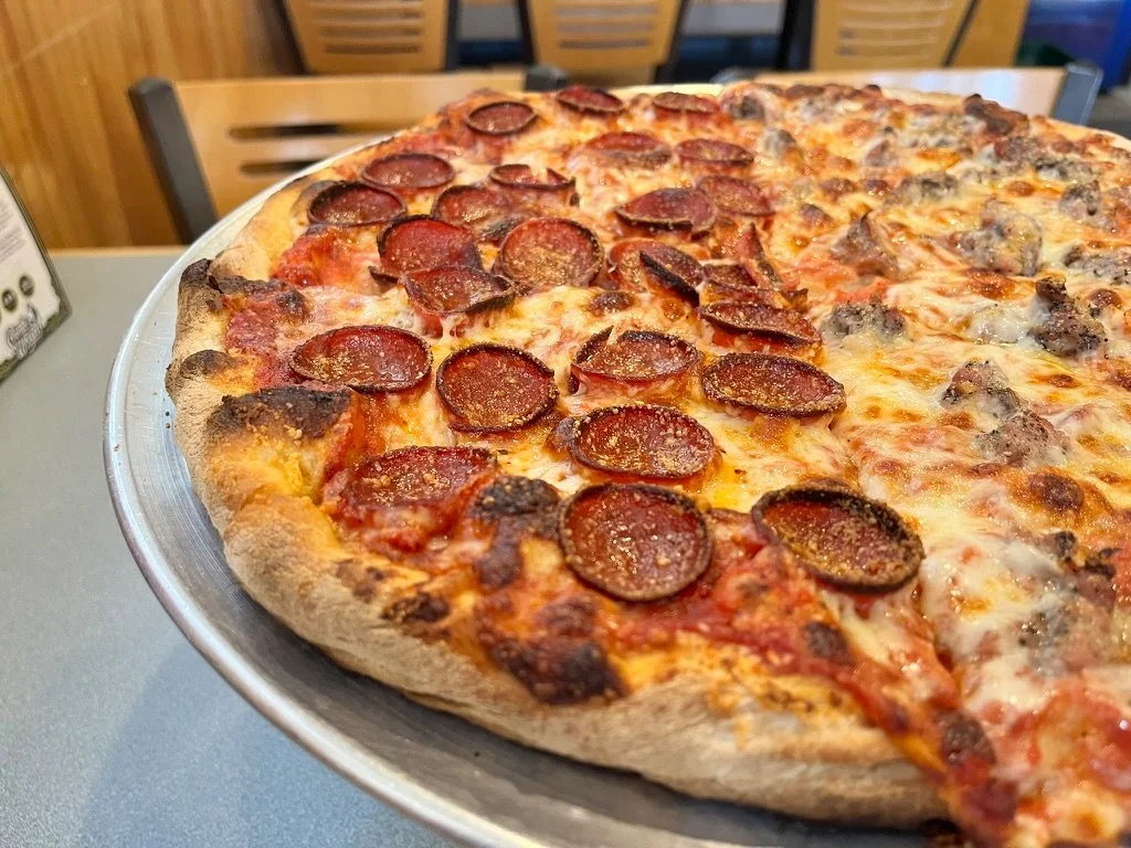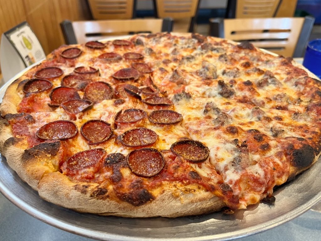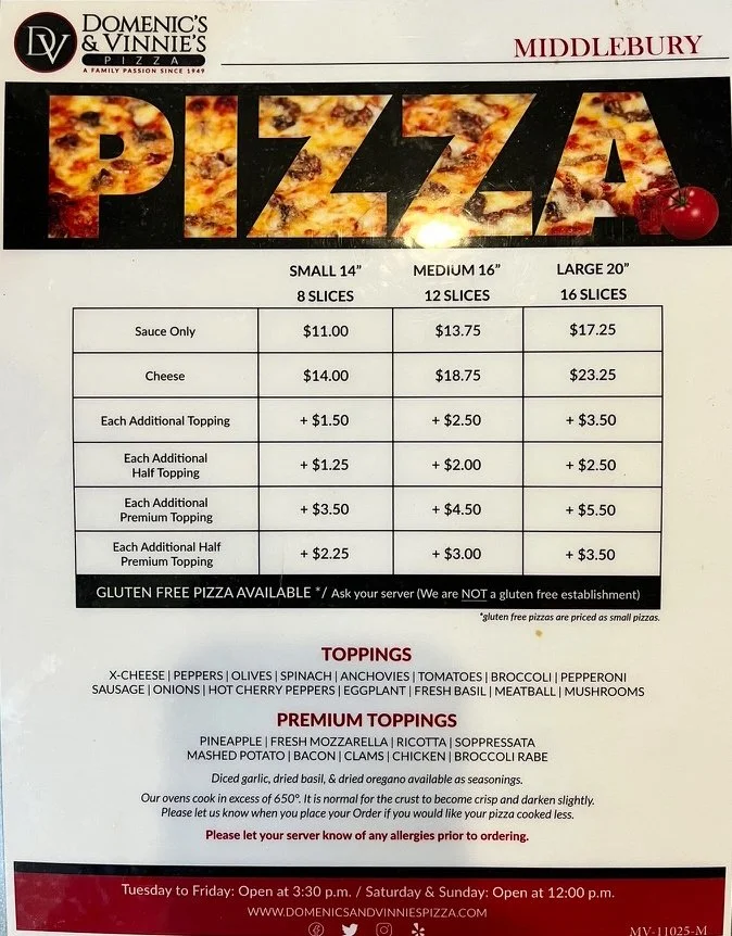Restaurant Pizza Middlebury Old School Domenic's & Vinnie's Pizza - Killing it in Waterbury Area for 75+ Years Jeff "jfood" Schlesinger July 02, 2025 My latest excursion into the great CT pizza offerings took me to Middlebury, CT, north of I-84 to Dominick’s & Vinnie’s, who proudly proclaim, “we serve only one item: pizza, in all its various forms.”Domenic’s & Vinnie’s is a family-owned destination that has been satisfying the greater Waterbury area at three different locations for over 75 years. The original location in Waterbury was opened in 1949 and the family later expanded, first to Middlebury and subsequently to Southington. The restaurant’s recipe dates back to the owners’ roots in Castelpaganica, Italy in a province known particularly for its superb cuisine, with all sauces and doughs made fresh daily, as well as their house-made meatballs and sausage. The Middlebury location is located in a strip mall at 1625 Straits Turnpike, and I drove right by the entrance to the mall. I circled around, followed the “trucks only” sign and eventually pulled up in front of the restaurant. The basic white concrete building sports a white sign with the D&V logo and very light-fonted “Domenick’s & Vinnie’s,” you need to look hard to find it the first time. Once you open the doors and enter the world of Domenic’s and Vinnie’s, it is a completely different experience, it is visual overload, with seating for 100 people in booths and tables in a bright and airy dining area. As you make your way to the back counter, your eyes are drawn to the sheer size of the open kitchen, it is enormous. On the entire right wall of the kitchen, extending over twenty feet from the counter to the rear, were ten pizza ovens, five double-stacked columns; how many pizzas could D&V produce on a busy night? And in the middle of the kitchen was an equally massive pizza prep area. On a lazy weekend afternoon, there were already three pizza makers busy preparing pizzas for in-house guests and takeaway orders. I ordered my normal half-sausage, half-pepperoni, and took a seat. This open and bright dining area was very different from the other pizza places I have visited in CT, where they are part of a neighborhood, or my eating a pie in the parking lot because of limited seating, or a dining area that felt more from the 1950’s or 60’s, D&V’s Middlebury location was large, open and bright. My expectations were very high for the product. When my order was brought to my table, it looked as good as any pizza I have ever seen. The sauce and topping almost reached the edges, which had just a few char marks, and limited poof. Visually it was a 10, and the aroma hit my nose “like a big pizza pie…” I pulled a little piece of the crust and tasted it. First, the texture was denser than I prefer, it was neither a crispy crack crust, nor a soft rendition, and the flavor was pretty good. My next stop was a slice of the pepperoni. The edges were crispy (positive #1), the slices were thicker than many others (positive #2), which allowed for a softness that I really liked (positive #3) and then the spice level kicked in, it was on the higher end of the spiciness scale, maybe a 7-8. If you like a spicier pepperoni, this will please you. Onto the sausage side and it was much milder, the kitchen was generous with the amount of crumbled pieces (my preference), they were still juicy and soft, and I was a big fan immediately. When I looked at the underside, it had a nice medium tan with just a few char marks, the kitchen did a great job in the prep and baking. Now for the big test. Given the spiciness of the pepperoni, I started with a sausage slice. As I pulled the slice, the cheese clung in long strands, there was a good amount of cheese and sauce. The flavors were great, the sauce had a deep tomato-ey freshness and there was just a hint of tang in the cheese, each played well with the fennel-laced sausage. The toppings were a 10 on the sausage side. Onto the pepperoni side with its added spiciness. For me, it was a little too spicy, for others, it may be perfect; it was hard for me, since I am not a huge fan of that level of spice. After a few bites I needed a plan B and I gently removed some of the pepperoni to taste a “plain” slice; it was more aligned with my strike zone, and I enjoyed that very much. Overall, Dominic’s & Vinny’s has a great pie; the sauce, cheese and sausage were excellent, for those who like a big kick in the pepperoni, you will probably enjoy that as well. As I have found with a few other places recently, I struggled with the texture of the crust, others will enjoy the denseness and chewiness more than I did. I strongly recommend a visit to Dominic’s and Vinnie’s, over 75 years at three locations tells you the people love the product. Dominic’s & Vinny’s 1625 Straits Turnpike, Middlebury, CT 203-758-8846